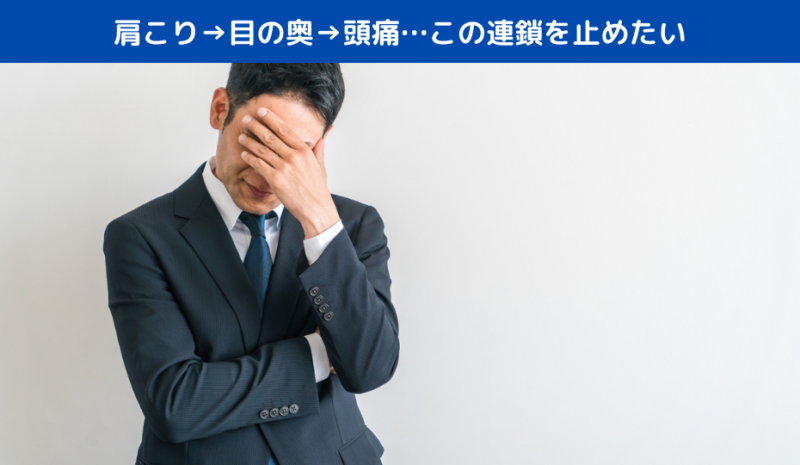 肩こりが強くなると、目の奥に痛みが出て頭痛につながることがよくあります。